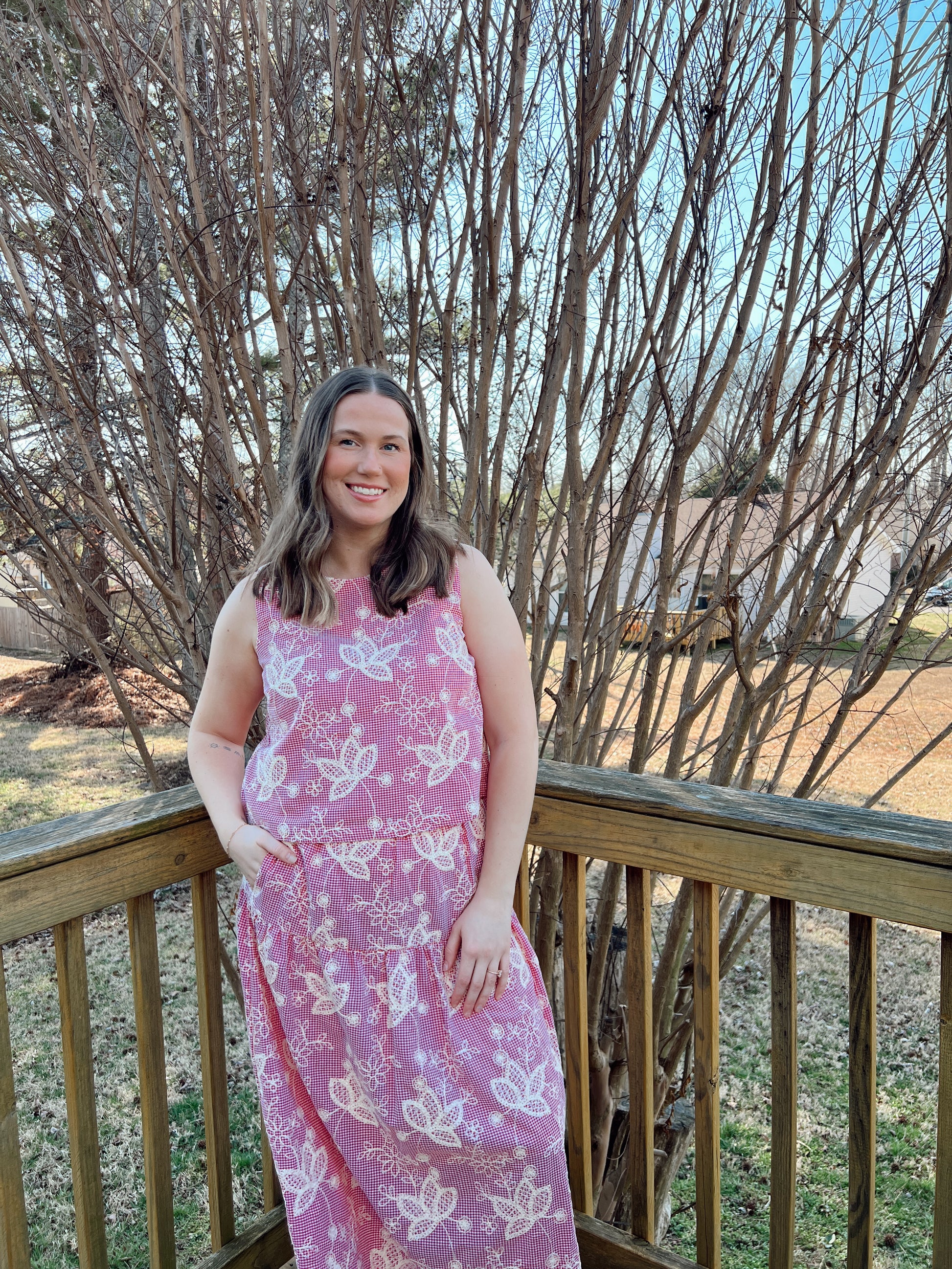 - Skirt is midi length with stretchy waistband